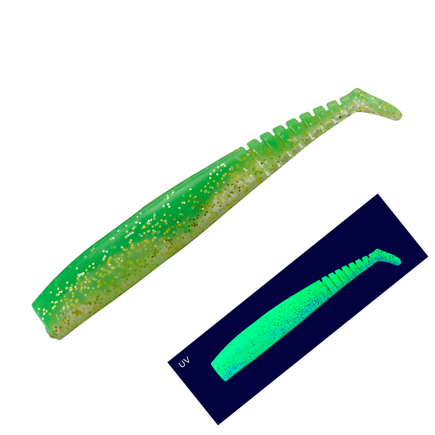 小さめのシャッドテールによってアクションは控えめで、空気抵抗が少なく飛距離も抜群です。細かくピリピリしたアクションはスレたフラットフィッシュに効果的です。アクションの派手目なワームとの併用でさらに効果的です。
