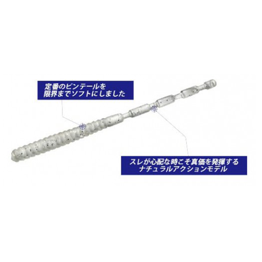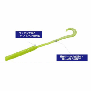 action: ワームを短くカットしたときのフッキング率と、ハイアピールを両立。極細テールは抵抗無く吸いまれる設計。