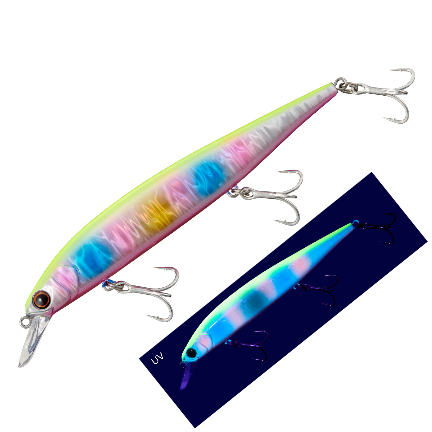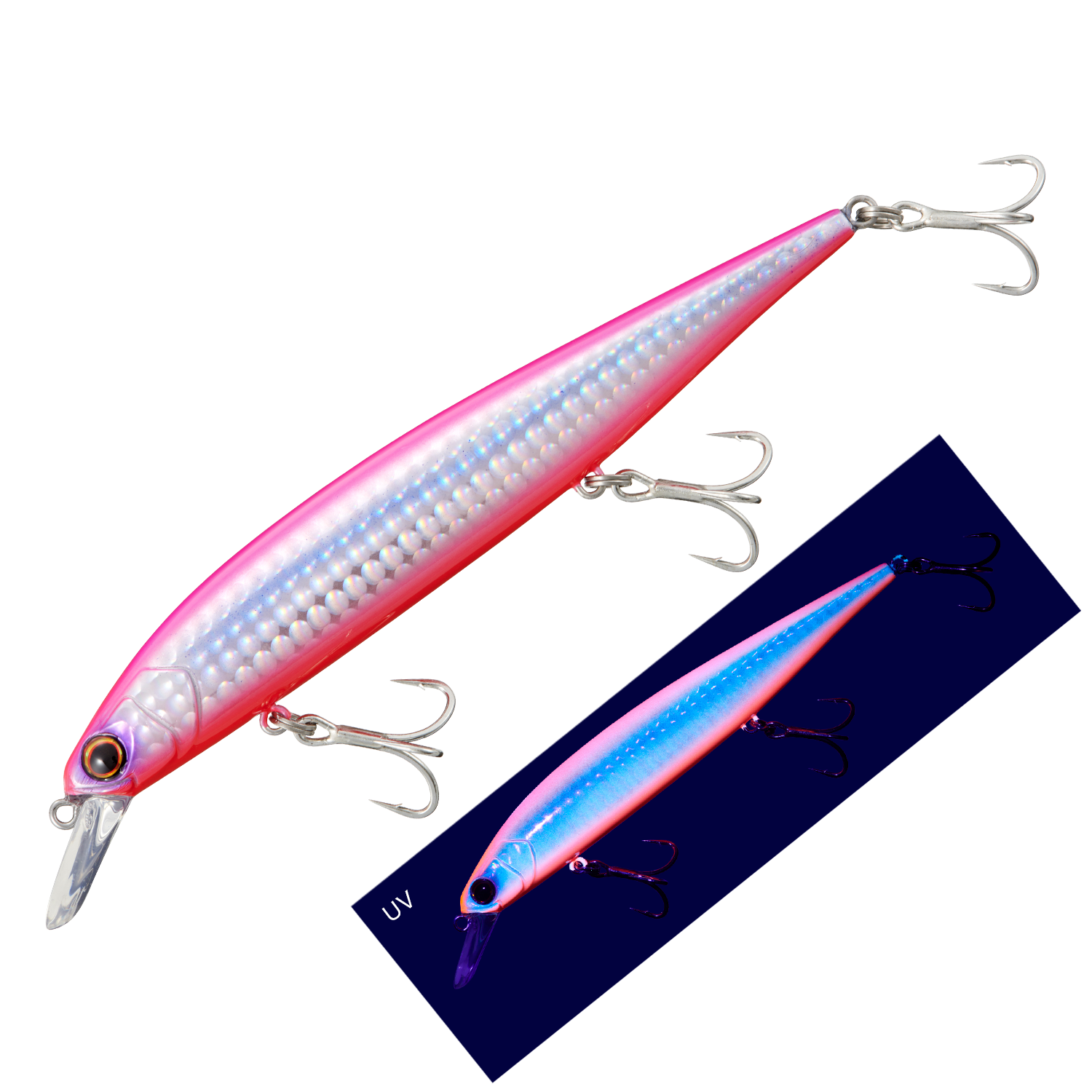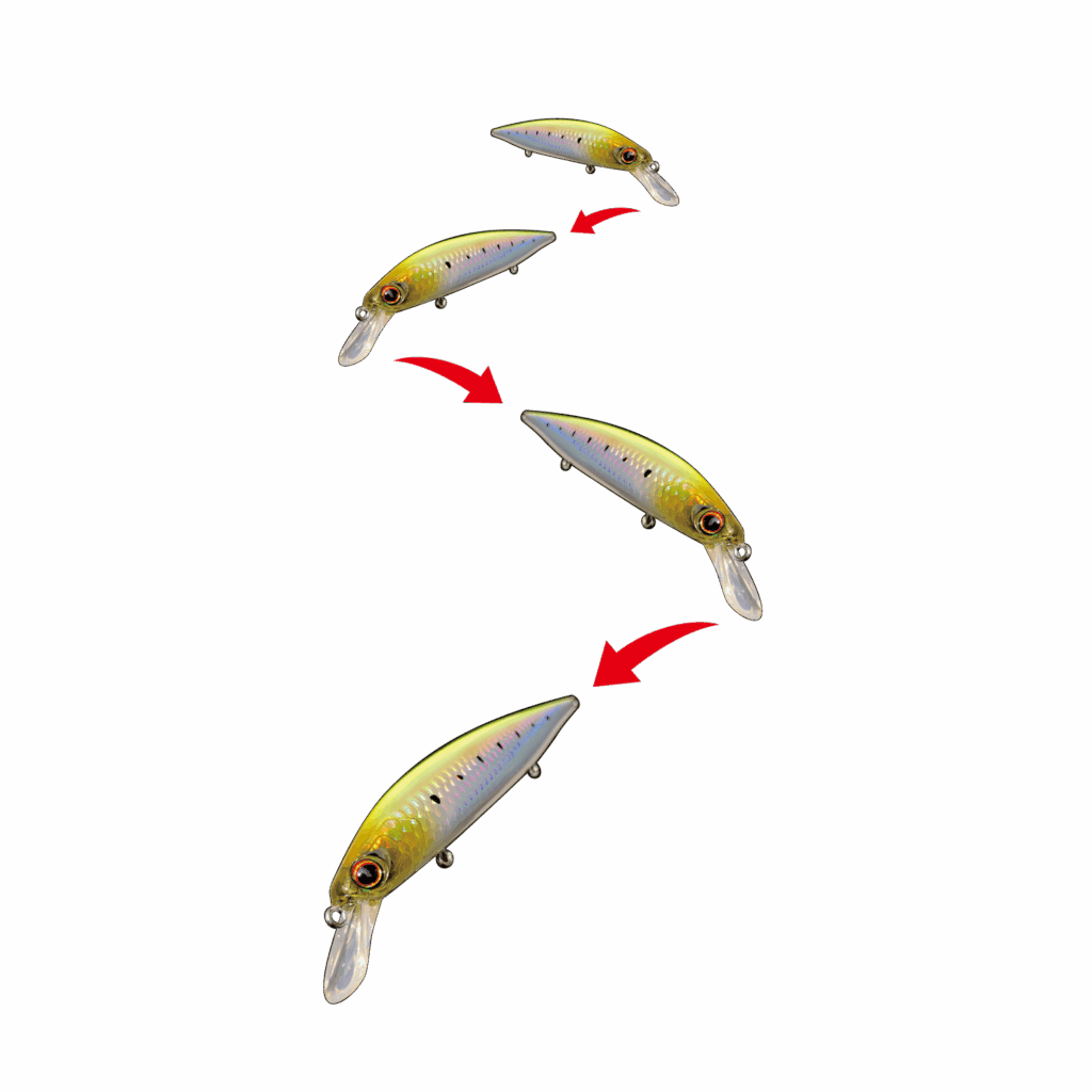 スイッチバック125のロールが入りながらヒラ打ちするジャーキング時のアクションは、フラッシングを強烈に起こしながら左右にダートします。この絶妙な「ヒラ打ちアクション」が明滅を生み出し、遠くのターゲットにルアーの存在をアピールすることで、軽い引き抵抗のミノーでありながら魚をひっぱる力があるミノーに仕上げています。また、ジャーク後のヘッドダウン姿勢でピタリと静止するアクションは、速やかに次のアクションに移行することを可能にし、連続ダートや高速域でも安定してアクションすることが可能です。