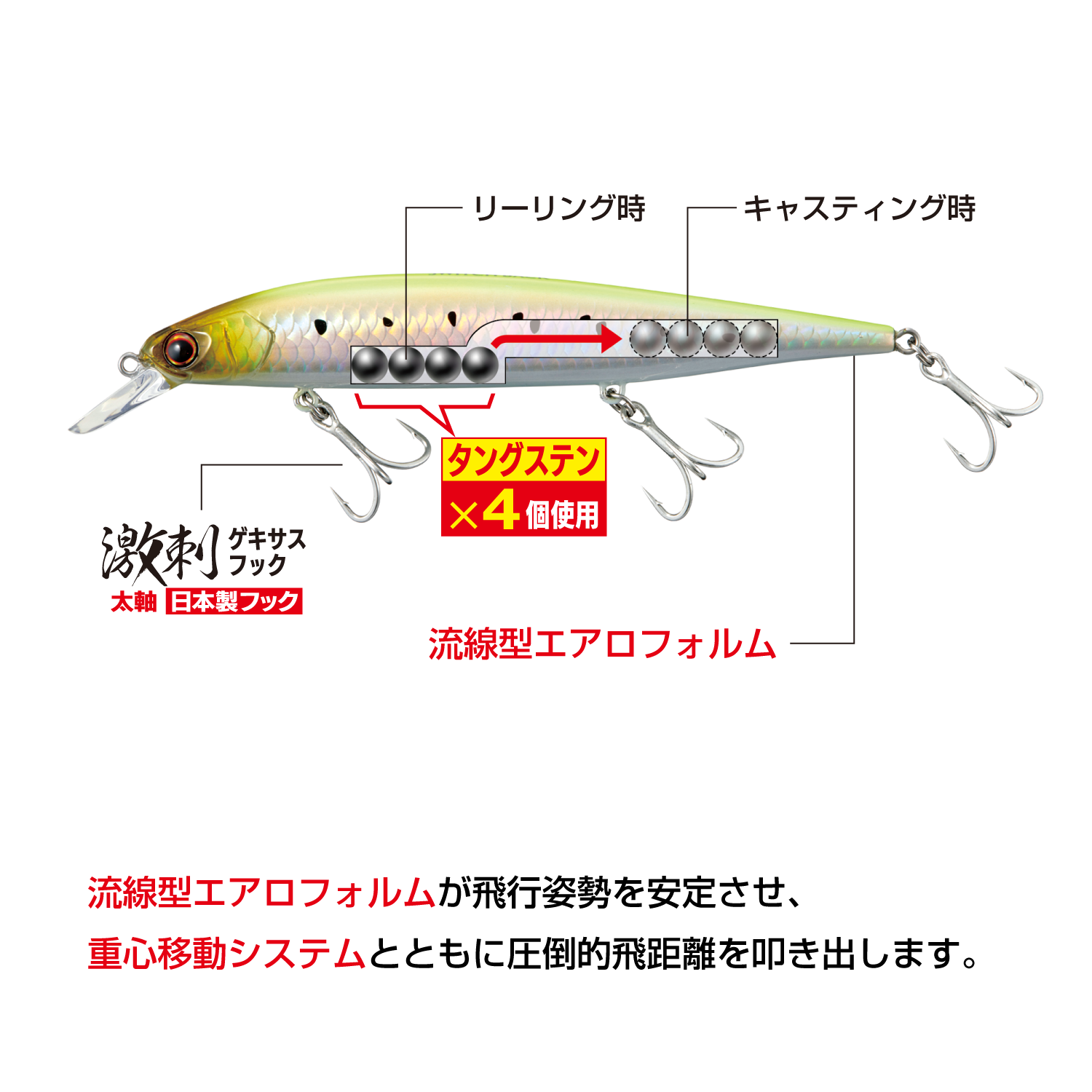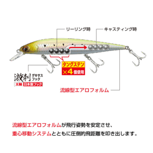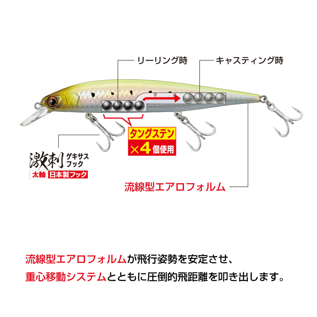 サワラキャスティングゲームでは必ずしも常に風を背負ってキャストできる状況ばかりではなく、不意に風上や潮上側にキャストしなければならないシチュエーションがあります。不意の魚の反応に対処しなければならない、そういった場合に横風を大きく受けて失速してしまうことや、飛行姿勢が安定しないミノーでは釣果に繋げることはできません。また、飛距離が安定して出せることにより、ターゲットがバイトしてくるレンジをより長くルアーを引けることでバイトチャンスを増やすことが可能です。