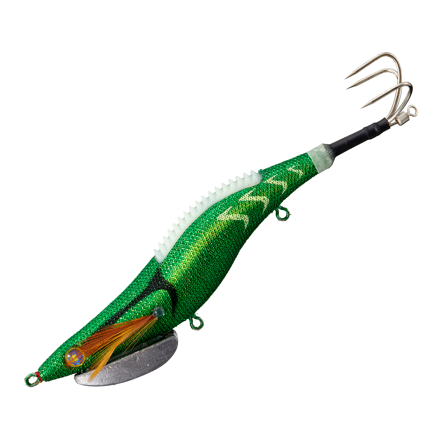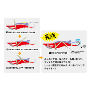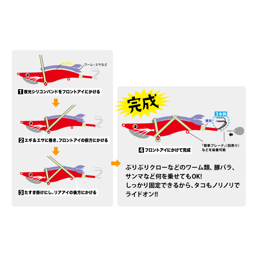 餌木の背中にプリプリクローなどのワームや脂身、サンマなどのエサを乗せて、専用のシリコンバンドで簡単固定が可能!餌木の背中の夜光剣山でワームやエサのズレを防止。リアにはブレードやタコベイトを装着すれば、更なるアピール効果を得られるでしょう。